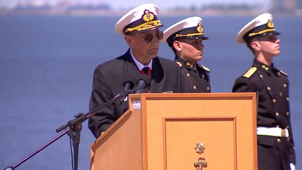 El almirante José Luis Elizondo pronunció un discurso en el acto por los 208 años de la Armada Nacional en el que participó el presidente Yamandú Orsi y la ministra de Defensa Nacional, Sandra Lazo.